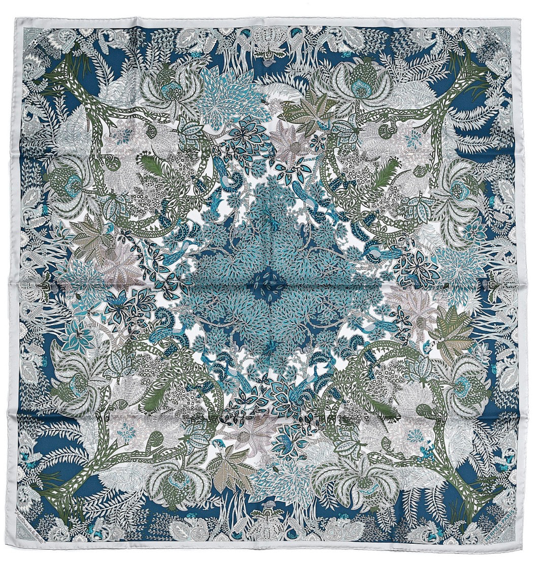 With the lightest of touches, Annie Faivre’s carré expresses the full force of nature: the vital energy and burgeoning growth of the plant kingdom. Plants and trees – the monarchs of the forest – form a dense, awe-inspiring ensemble, reaching ever-upwards to the light. Stems, leaves and flowers recall the finesse of traditional Kashmiri motifs, created by Indian weavers for the infinitely soft woollen shawls adopted by fashionable European women from the mid-18th century onwards. French textile companies were quick to follow suit, creating their own versions.