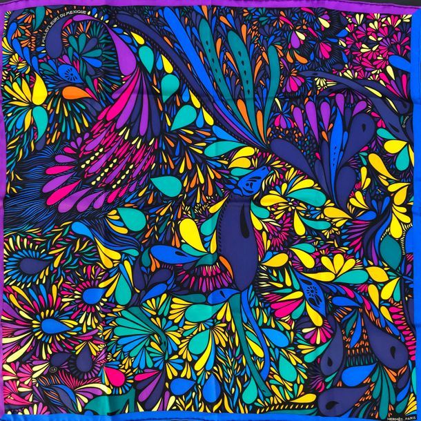 Hermes vintage silk twill scarf, hand rolled, 28" x 28" Color : purple/yellow/hard blue