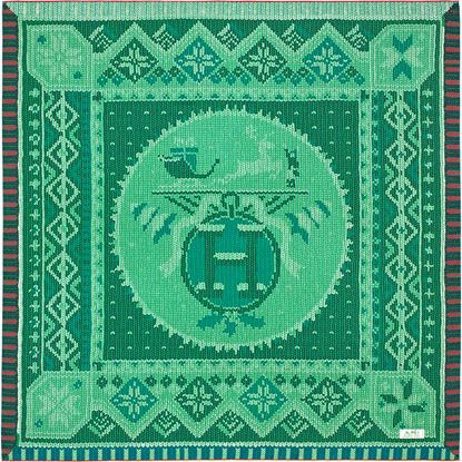 Once again, Dimitri Rybaltchenko’s imagination has transformed the Hermes Ex-Libris! This design magically metamorphoses the silk twill to look like a Jersey knit, a technique that takes its name from the largest of the Channel islands located just off Normandy’s Cotentin Peninsula. Framed by jacquard motifs evocative of ski sweaters, large and small snowflakes and borders, the harnessed horse is transformed into a bounding reindeer, the carriage into a sleigh loaded with presents, the groom into a cheery young mountain boy and the caduceus into a pair of Christmas trees. Winter is approaching – it seems to say – heralding cozy nights by the fire accompanied by the click of knitting-needles.